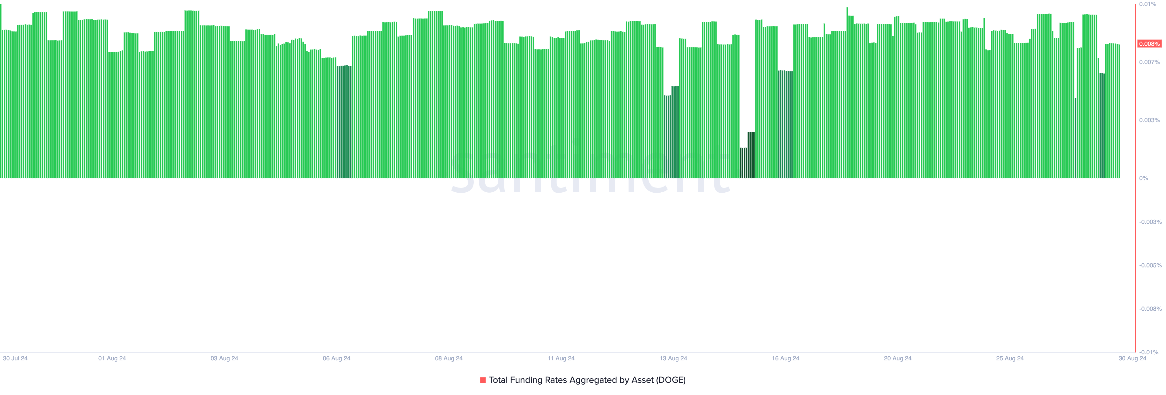 Trods DOGE’s tekniske indikatorer, der antyder en forlænget nedadgående trend, fortsætter futureshandlere med at åbne lange positioner, som vist ved dens positive funding rate på tværs af kryptobørser. I øjeblikket er DOGE’s funding rate på 0,008%.