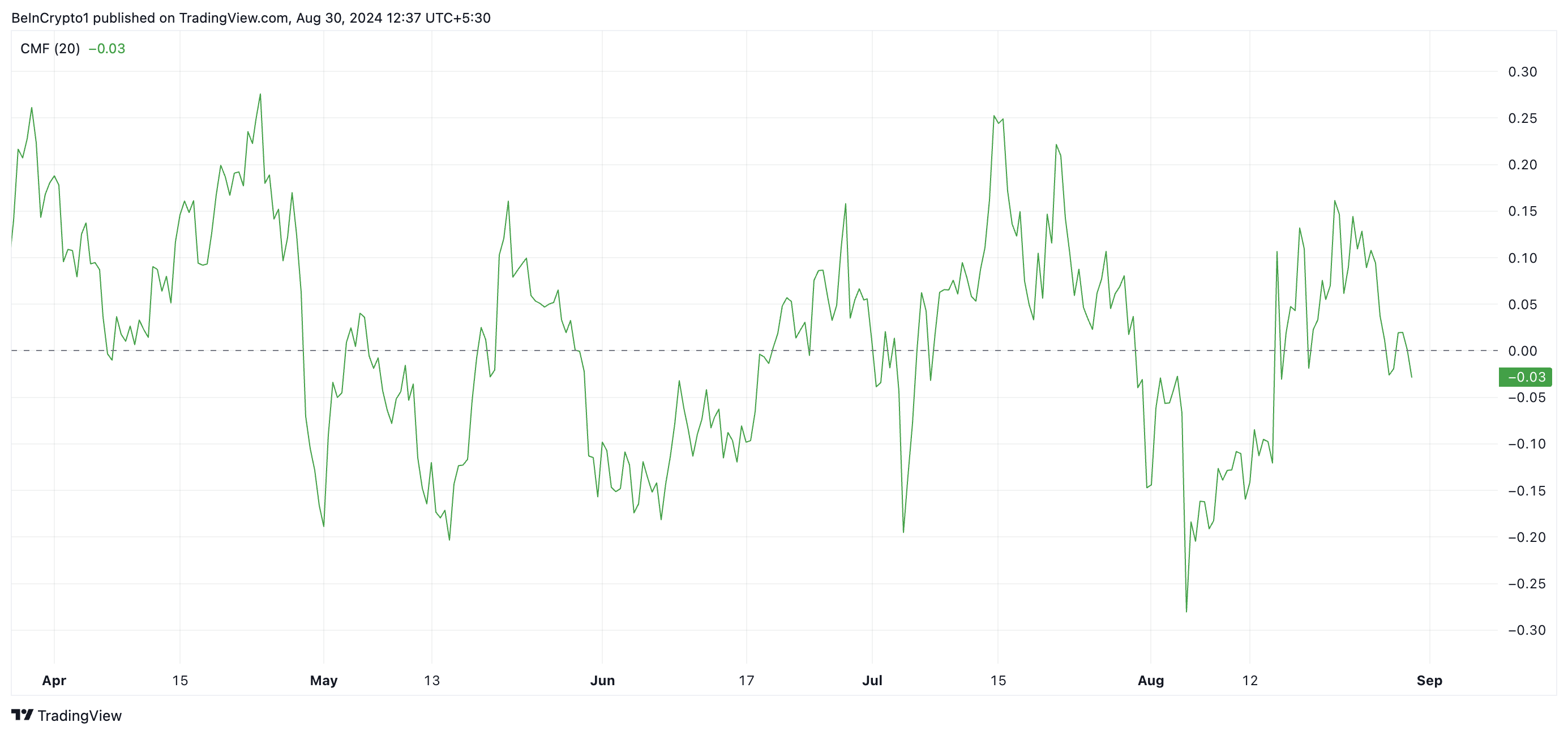CMF måler pengestrømmen ind og ud af et aktivs marked. En CMF-værdi under nul antyder markedssvaghed og likviditetsudstrømning, hvilket handlere ofte tolker som en forløber for et vedvarende kursfald under en nedadgående trend.