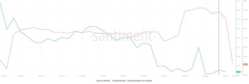 Whale-investorer, der holder store mængder DOGE, har reageret hurtigt på den stigende bearishhed. I løbet af de sidste 48 timer har adresser, der holder mellem 100 millioner og 1 milliard DOGE, solgt hele 2 milliarder DOGE, til en værdi af over $400 millioner.