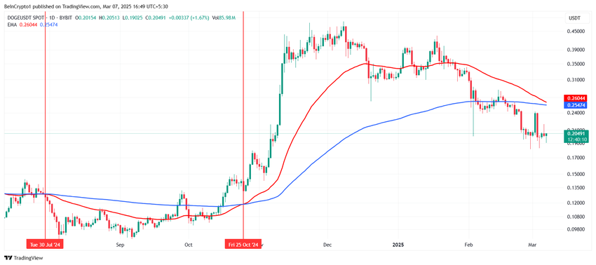 Den vigtigste tekniske indikator at holde øje med er det forestående Death Cross, hvor den 200-dages eksponentielle glidende gennemsnit (EMA) er på vej til at krydse under den 50-dages EMA. Dette markerer det første Death Cross i 8 måneder, hvilket afslutter en 5-måneders bullish periode for Dogecoin