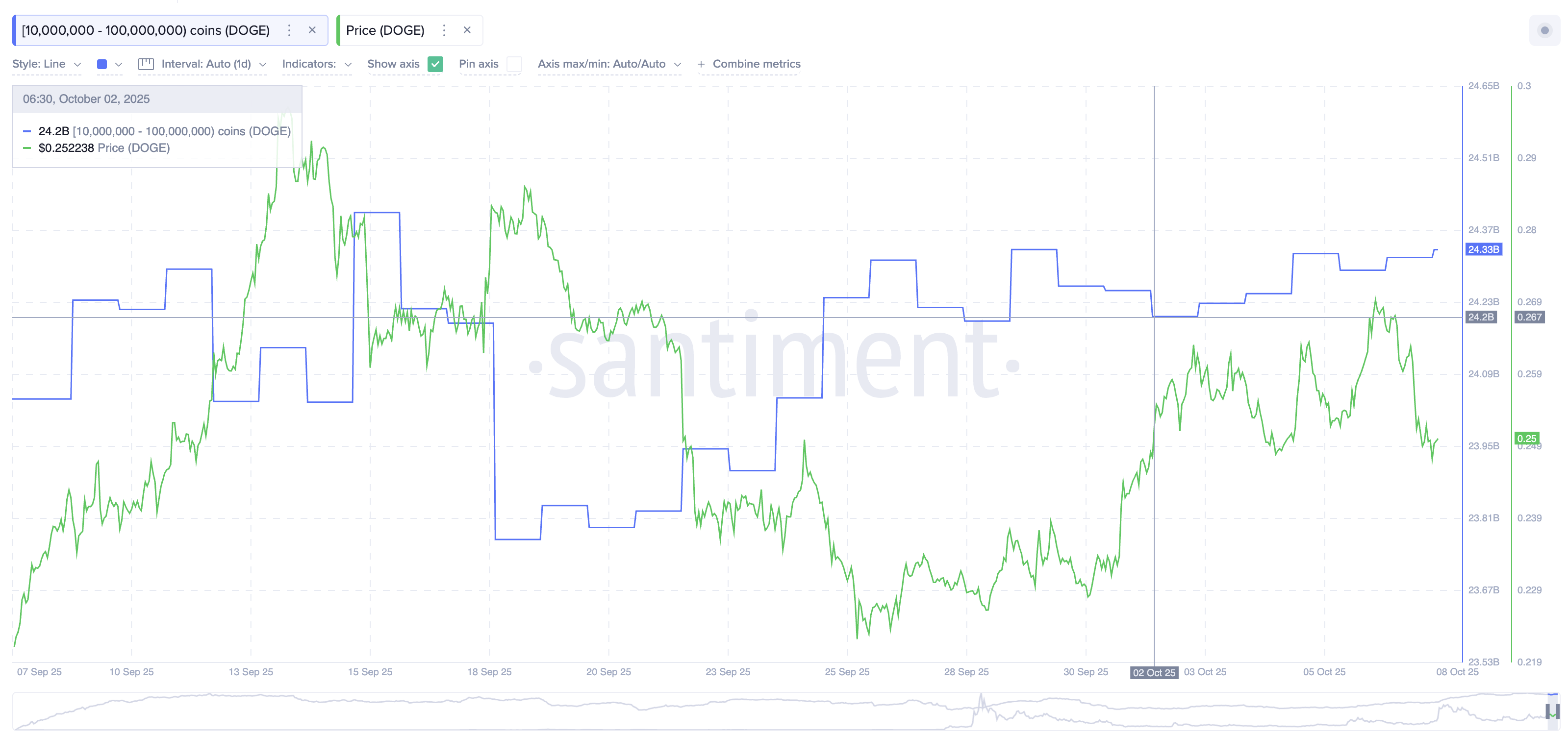 Hvalaktivitet er stille og roligt blevet positiv. Wallets, der holder 10 millioner til 100 millioner DOGE, har øget deres beholdninger fra 24,20 milliarder DOGE den 2. oktober til 24,33 milliarder DOGE — en tilføjelse på omkring 130 millioner DOGE, cirka 32 millioner dollars ved den nuværende Dogecoin-kurs.