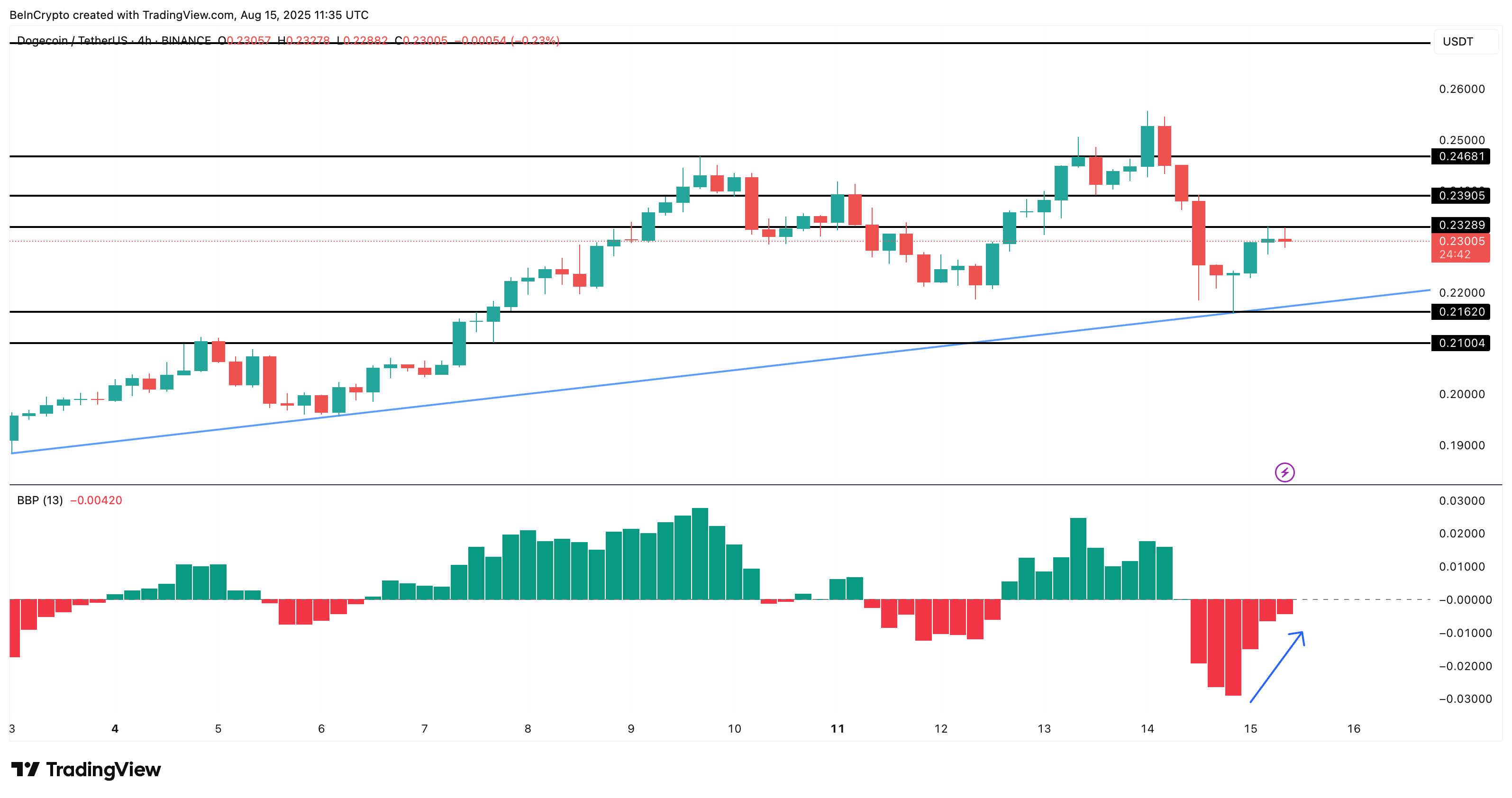 Området $0,232 er blevet bestridt gentagne gange; klar accept over det ville give momentum tilbage til købere og kan trække den daglige struktur højere. Bull-Bear Power på 4-timers tidsrammen løfter sig fra sine lavpunkter, hvilket antyder, at bear-pres falder ind i denne klemme.