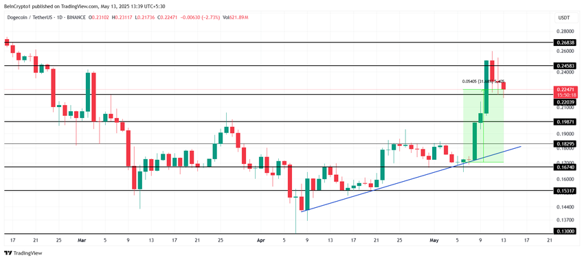 Dogecoins kurs ligger i øjeblikket på $0,22 efter en stigning på 31% i den seneste uge. Mens den holder sig over dette vigtige støtteniveau, antyder den spekulative karakter af stigningen, at den sandsynligvis ikke vil fortsætte med at stige. Markedsforholdene og manglen på solid efterspørgsel øger chancerne for en vending.