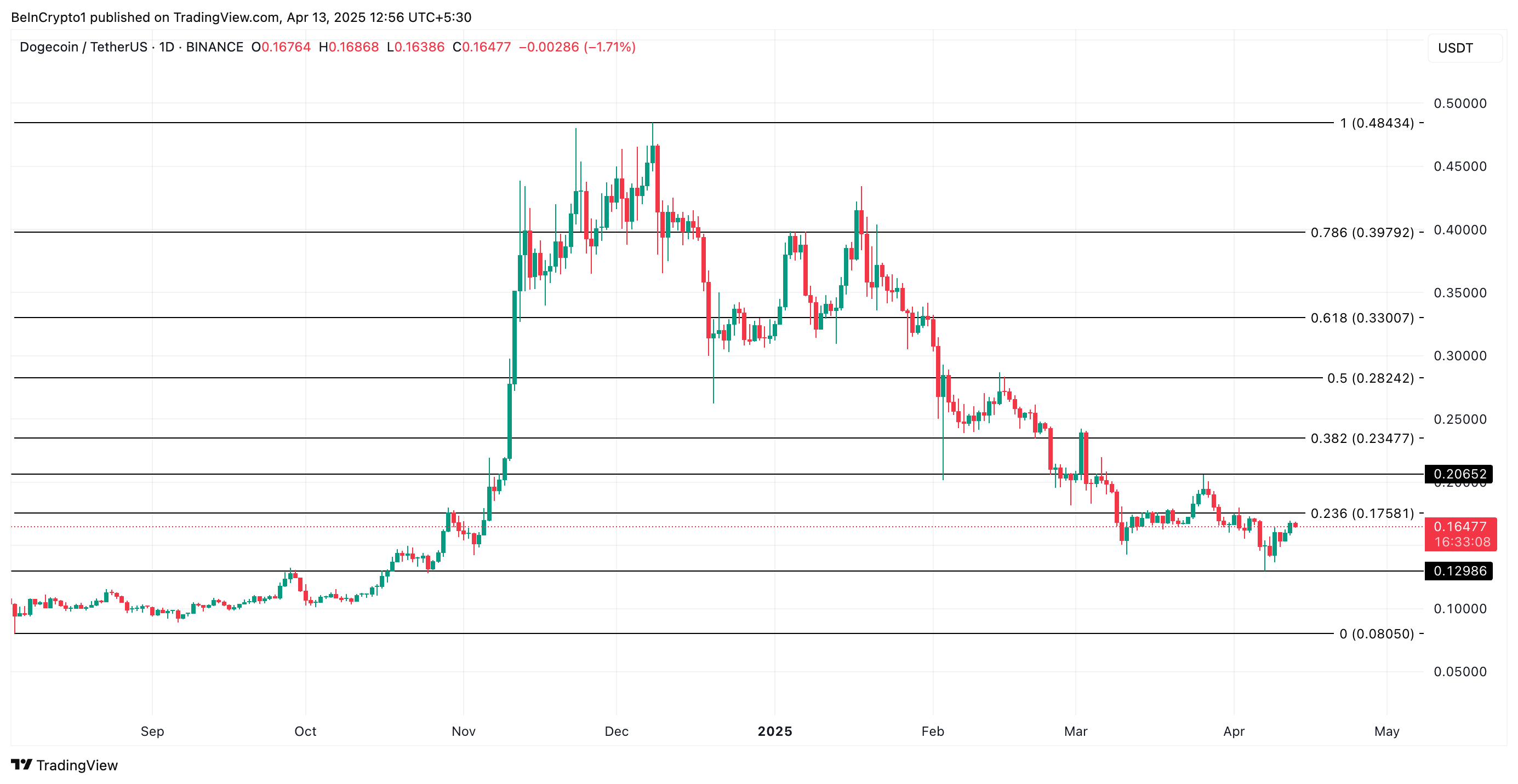 Med kryptomarkedets volatilitet forstærket af Donald Trumps igangværende handelskrige og DOGE’s nuværende udfordringer med at tiltrække nye investeringer, kan meme coinen teste nye lavpunkter på kort sigt. Hvis salgspresset styrkes, kan DOGE genbesøge sit årets laveste på $0,12.