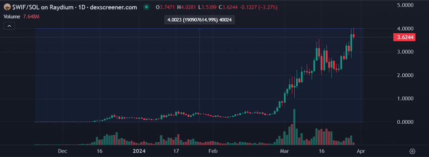 Solanas sæson for memecoins fortsætter, da dogwifhat (WIF) fredag oplevede, at dens markedsværdi nåede 4 milliarder dollars.
