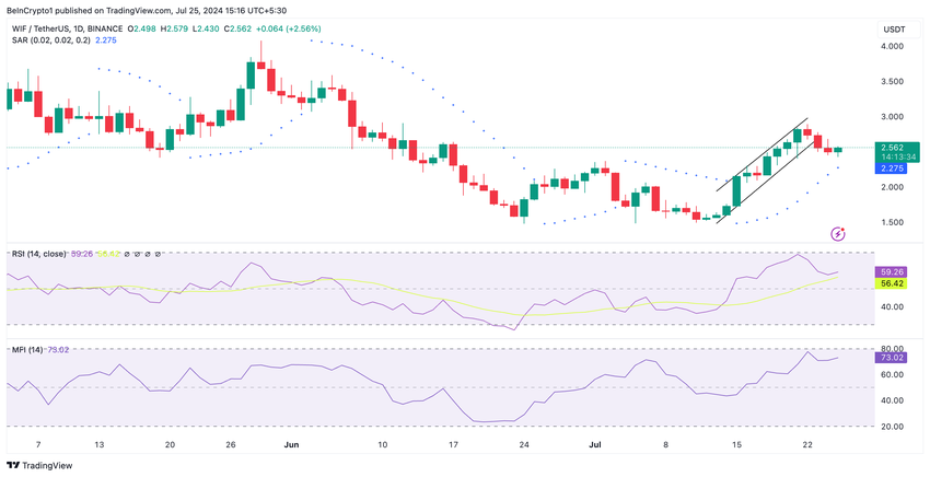 I øjeblikket er dens Relative Strength Index (RSI) i en opadgående trend på 59,33, mens dens Money Flow Index (MFI) er på 73,06. Værdierne af disse indikatorer tyder på, at WIF-akkumuleringen betydeligt overgår salgsaktiviteten.