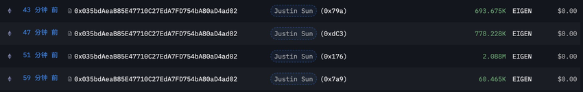 Medlemmer af fællesskabet afslørede, at Justin Sun, grundlæggeren af TRON-netværket, modtog ca. 3,62 millioner EIGEN-tokens via fire adresser.
