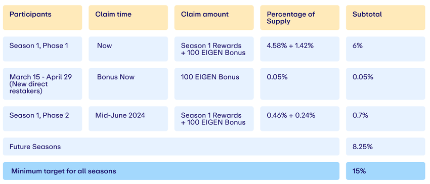 EigenLayer sigter mod at tildele 15 % af sin samlede tokenforsyning på 1,6 milliarder til brugerne. Efter kontroverser omkring den første airdrop er der planlagt en anden fase af Season 2 airdrop i midten af juni. Den vil uddele 0,7 % til kvalificerede deltagere, herunder brugere af populære udbytte-landbrugsapps som Pendle, Kelp og Equilibrium.