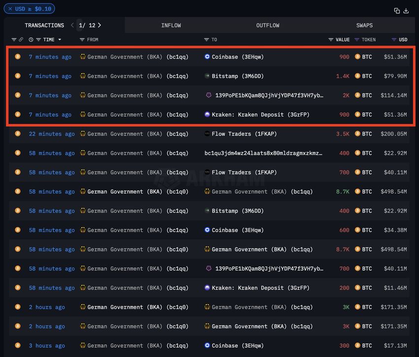Interessant nok viser Arkhams data, at de tyske myndigheder modtog næsten 3,000 BTC tilbage senere på dagen, primært fra Coinbase, Kraken og Bitstamp. Den tyske regerings nylige BTC salg har udløst diskussioner blandt brancheeksperter.