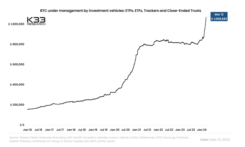 “Bitcoin-ETF’erne fik en nettotilstrømning på over 1 milliard dollars i går. Som reference vil vi efter halveringen se 33 millioner dollars i BTC udvundet per dag. Så denne ene dag med indstrømning svarer til en hel måneds Bitcoin-minedrift efter den kommende halvering,” forklarer DaanCrypto.