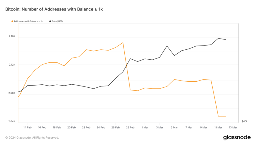 For at øge kompleksiteten har on-chain-analytikeren Ali Martinez fremhævet en bekymrende tendens blandt Bitcoin-hvaler. Martinez’ analyse afslører, at indehavere af over 1.000 BTC i stigende grad afvikler deres beholdninger, med et fald på 4,83% i sådanne adresser observeret i løbet af de sidste to uger.