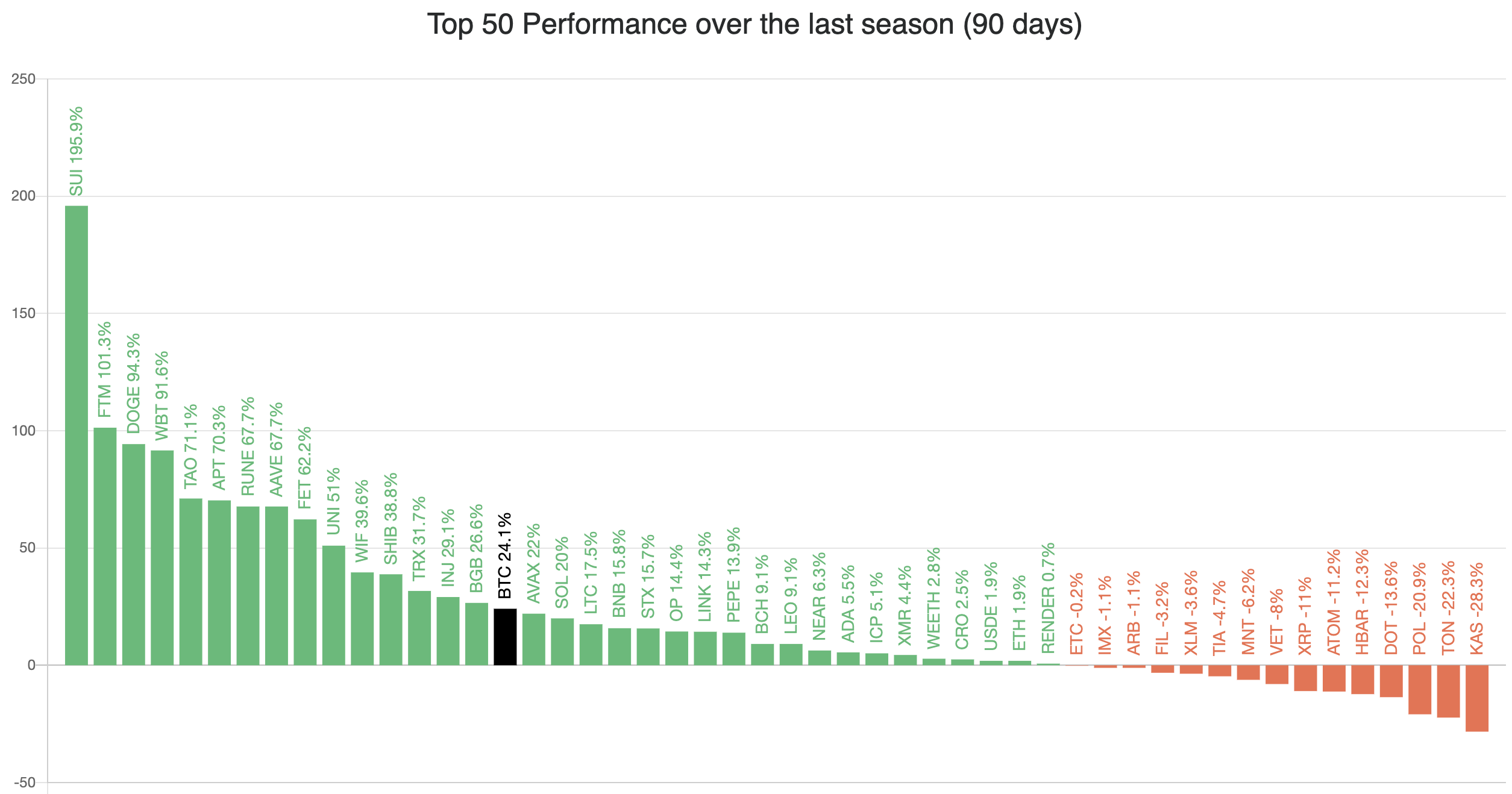 Denne krypto udelukker stablecoins som USDT, USDC og lignende. Men som nævnt ovenfor har 15, svarende til 30%, gjort dette over de sidste 90 dage. Nogle af de altcoins med bedre præstationer inkluderer Sui (SUI), Fantom (FTM), Uniswap (UNI) og Dogecoin (DOGE), for blot at nævne nogle få.
