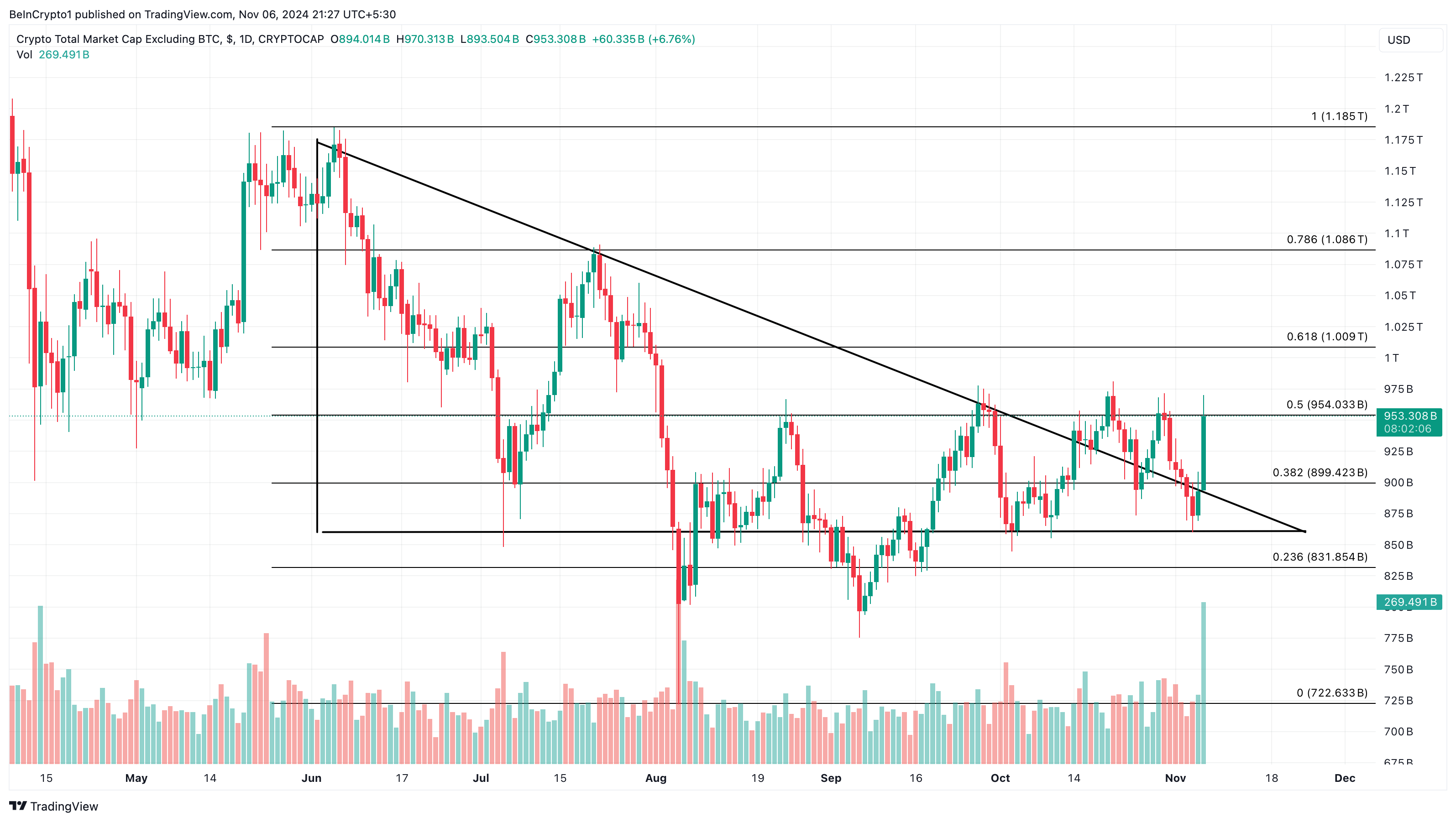 Men i dette tilfælde er det brudt over den faldende trendlinje, hvilket antyder, at den næste altcoin-sæson er næsten her. Skulle det være tilfældet, kan værdien af TOTAL2 stige over 1 billion dollars i markedsværdi for at bekræfte udsigten.