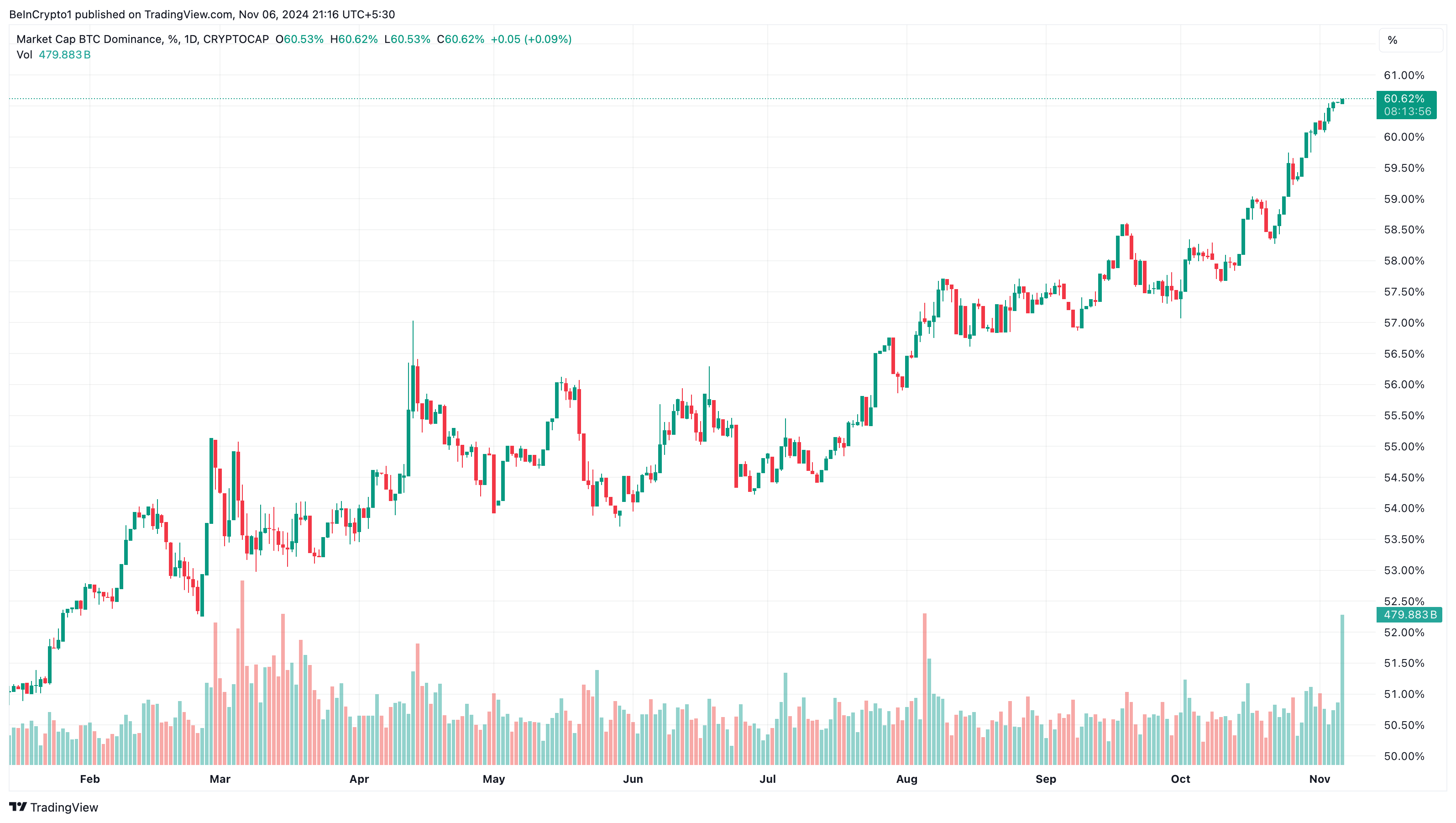 Men investorer skal være opmærksomme på Bitcoins dominans (BTC.D). Bare i dag, har Bitcoins kurs nået en ny rekordhøjde i kølvandet på Donald Trumps valg som USA’s nye præsident, hvilket bringer Bitcoins dominans til en ny højde på 60,61%.