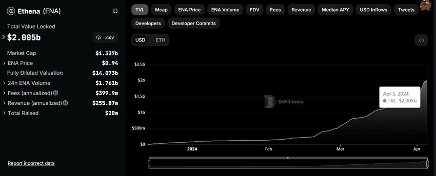 Baseret på data fra DefiLlama lå Ethenas TVL den 1. april på 1,54 milliarder dollars. På bare fire dage har den passeret 2 milliarder dollars, hvilket er en vækst på omkring 30 %. Denne markante stigning understreger den voksende investorinteresse i det, Ethena tilbyder.