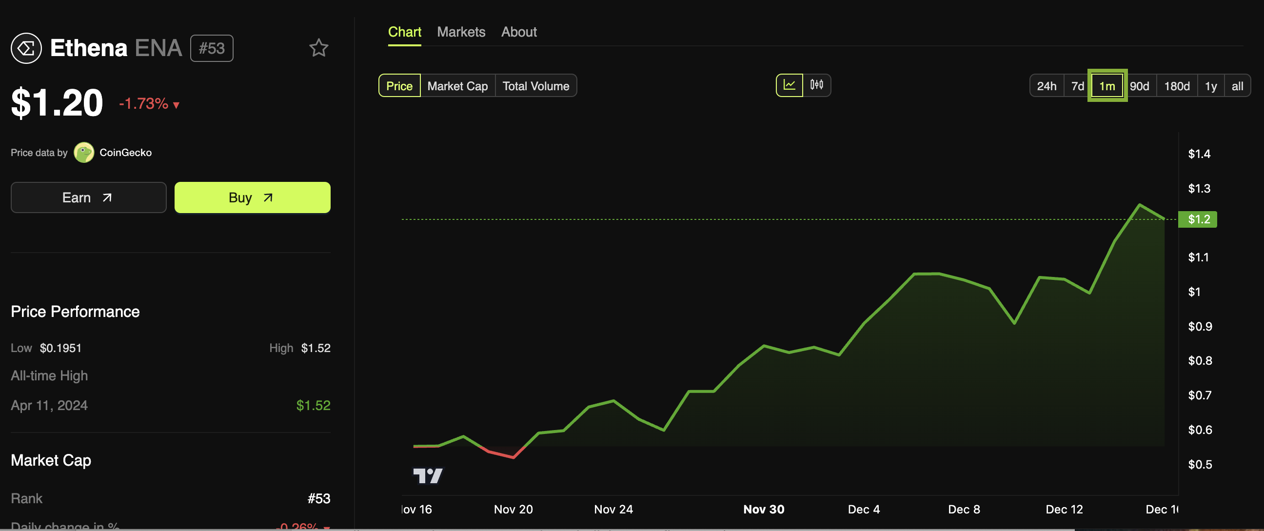 I mellemtiden er interessen omkring denne lancering blevet afspejlet i Ethenas token. Efter nyheden steg ENA til sin højeste kurs siden april, og nåede $1,32. Siden da har den oplevet kortvarige korrektioner og handles i øjeblikket til $1,20. Tokenet er steget næsten 117% i den sidste måned.
