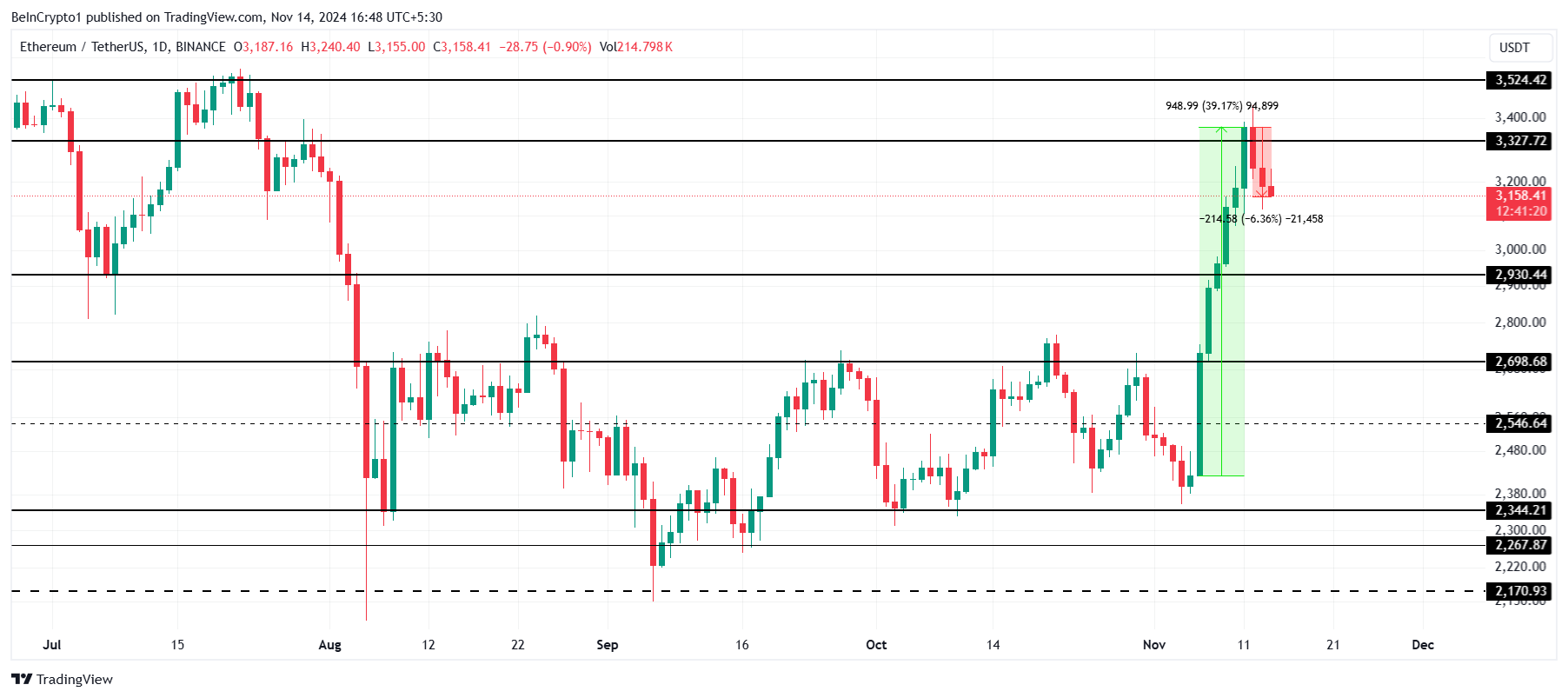 Sidste uge steg Ethereums kurs med 39%, hvilket skubbede den over $3,327. På trods af denne gevinst lykkedes det ikke ETH at sikre $3,327 som et støtteniveau, hvilket førte til et fald på 6% over de sidste 72 timer. Dette tilbageslag har trukket Ethereum længere væk fra den kritiske modstand på $3,524.