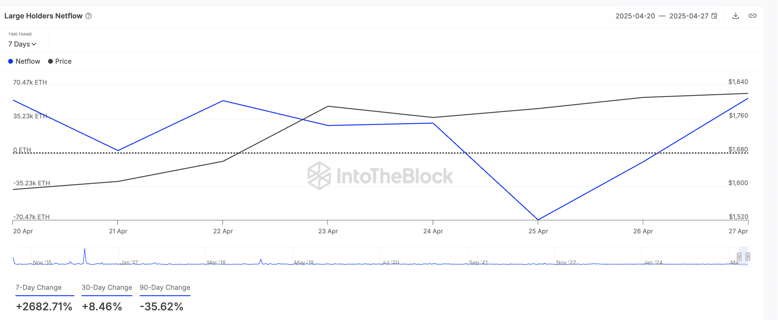 Ifølge on-chain data har den førende altcoin ETH oplevet en markant stigning i sine store indehaveres netflow i løbet af den seneste uge. Ifølge on-chain dataudbyderen er dette steget med 2682% i de sidste syv dage.