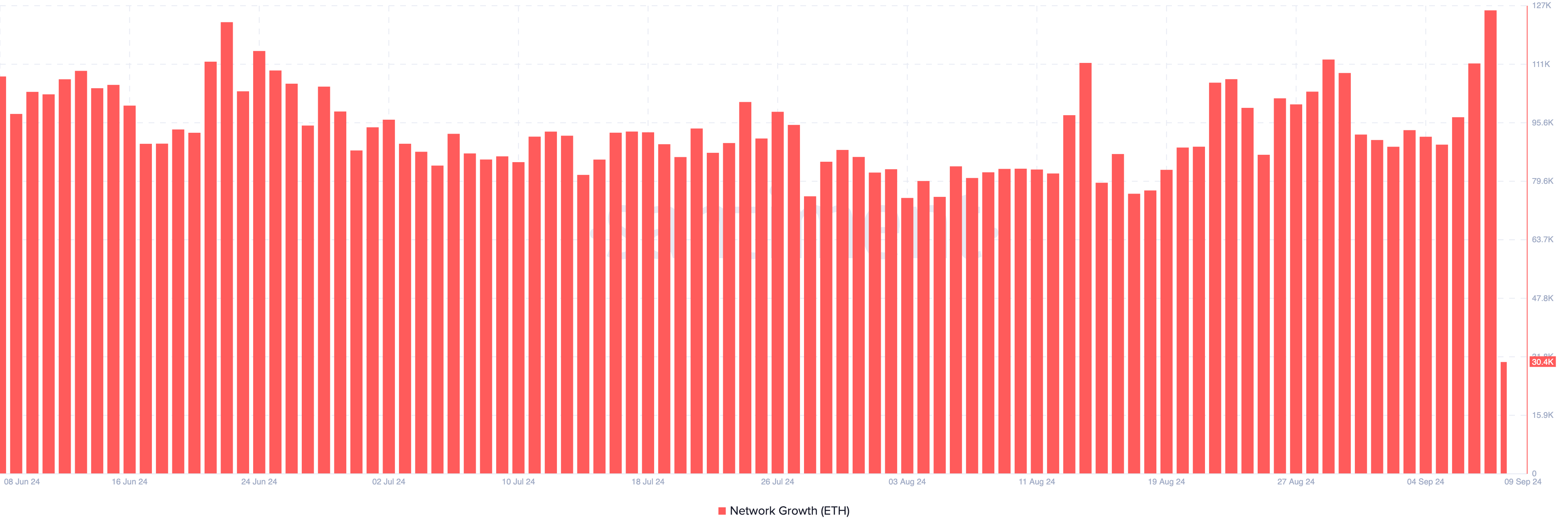 På detailmarkedet viser data fra Santiment en markant stigning i nye Ethereum wallets skabt søndag den 9. september. Netværksvæksten sprang til 126.000, hvilket markerer det højeste niveau i næsten fire måneder og indikerer en øget efterspørgsel efter ETH.