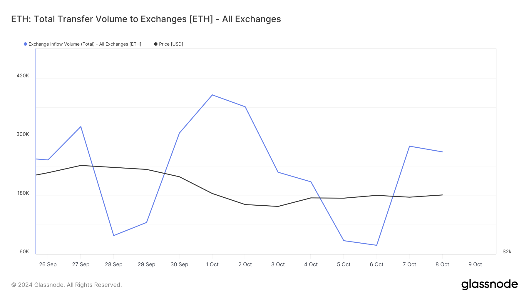 Desuden afslører data fra Glassnode en markant stigning i mængden af ETH, der strømmer ind på børserne. Den 6. oktober var det samlede inflow på børserne 78.127 ETH, men det er nu steget til 268.956 ETH — en tredobling på mindre end fem dage.