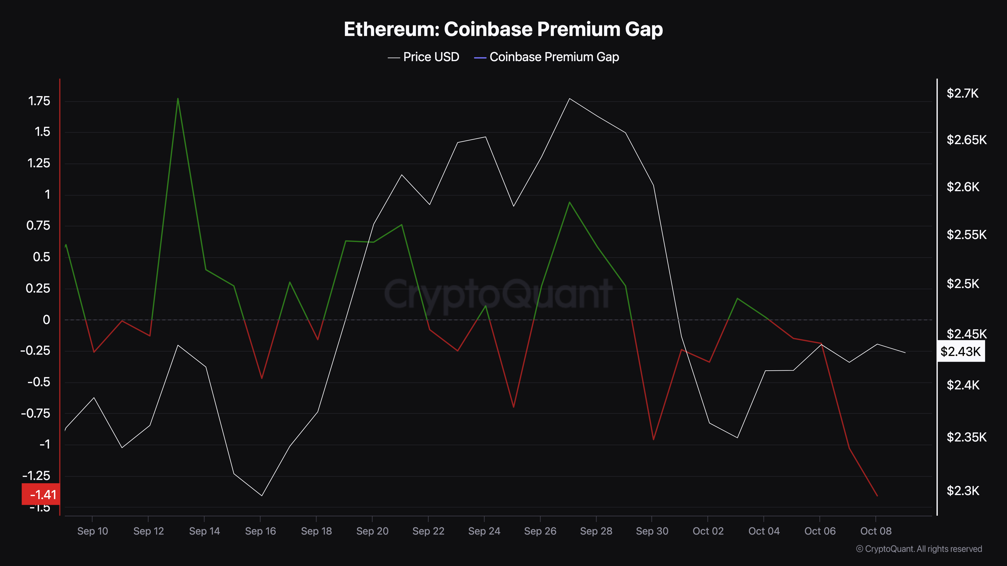 Lave værdier tyder derimod på stigende salgspres. Den 27. september var premium-gappet 0,94, hvilket faldt sammen med ETH’s prisstigning til 2.694.