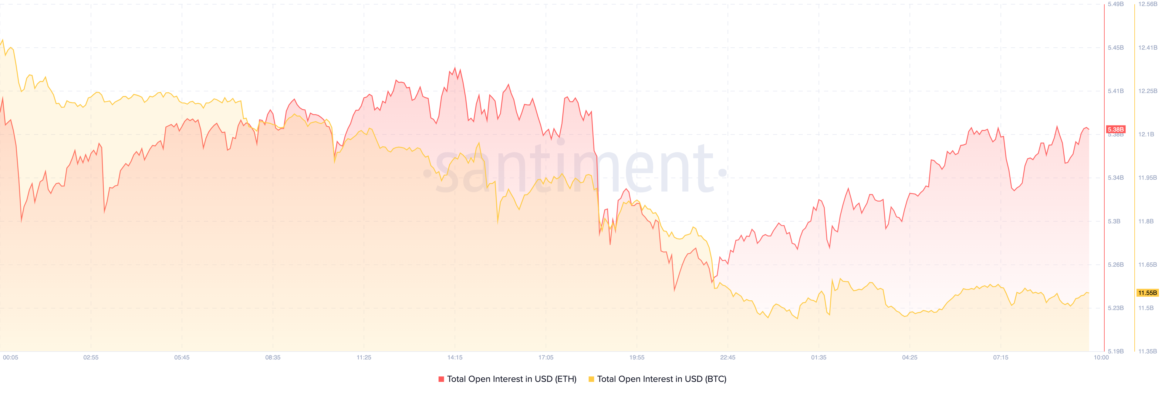 Den 26. august var Bitcoins Open Interest (OI) over 12 milliarder dollars. I øjeblikket er det faldet til 11,55 milliarder dollars, hvilket indikerer, at positioner til en værdi af 500 millioner dollars er blevet lukket i de seneste 24 timer. I modsætning hertil er Ethereums OI steget fra 5,25 milliarder dollars i går til 5,38 milliarder dollars i dag.