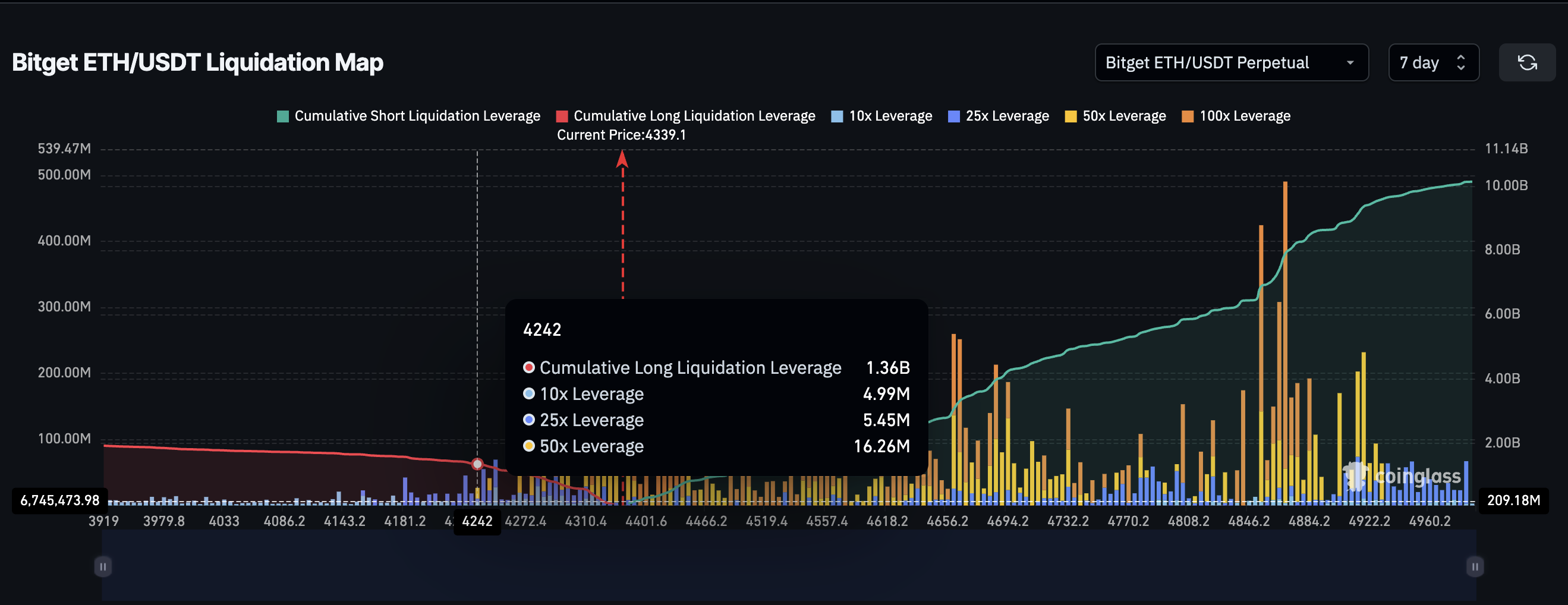 Udover on-chain signaler stemmer diagrammerne også overens med den opadgående trend. På Bitget-afviklingsvarmekortet starter opbygningen af korte positioner ved $4.400, hvilket gør niveauet til et kritisk omdrejningspunkt.