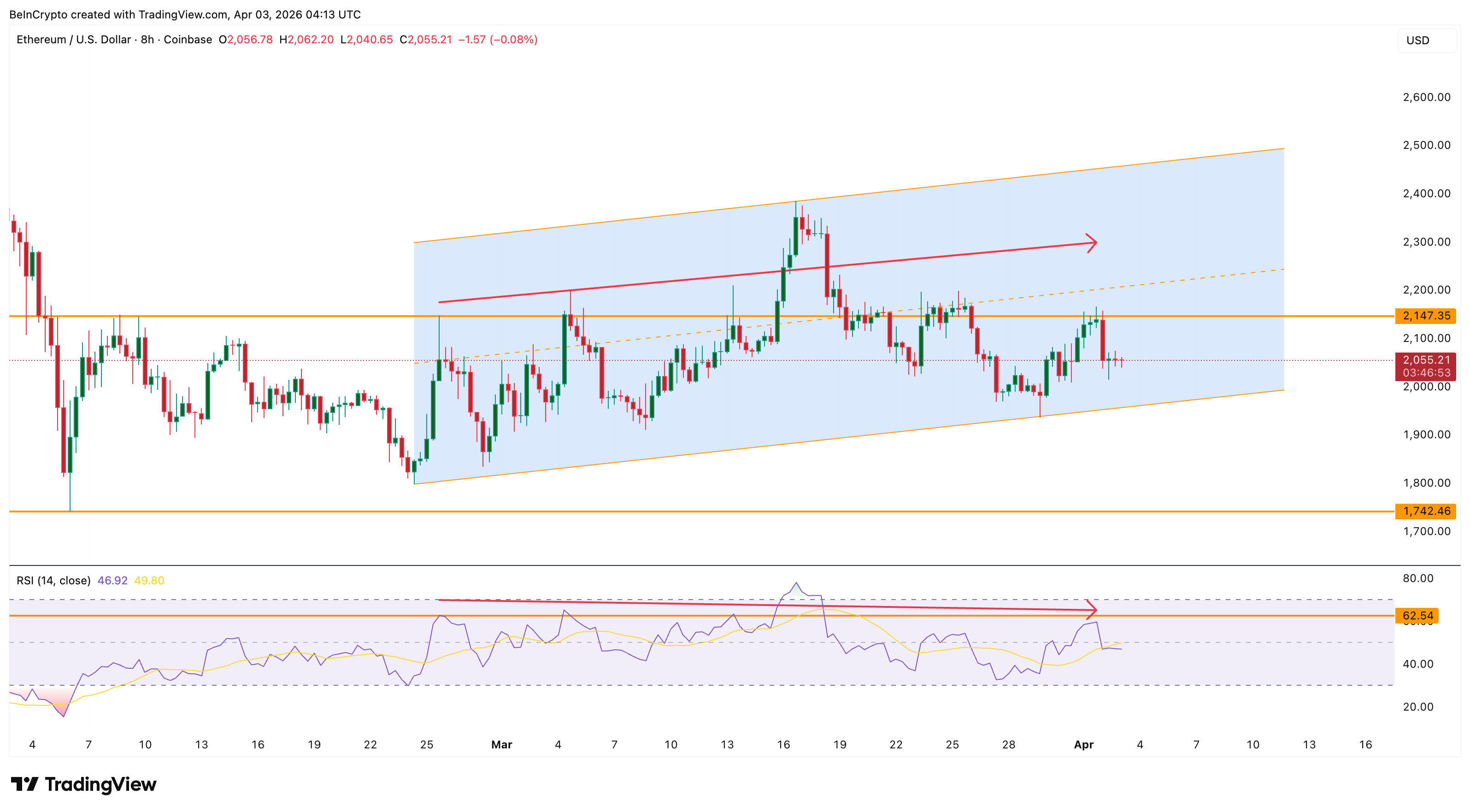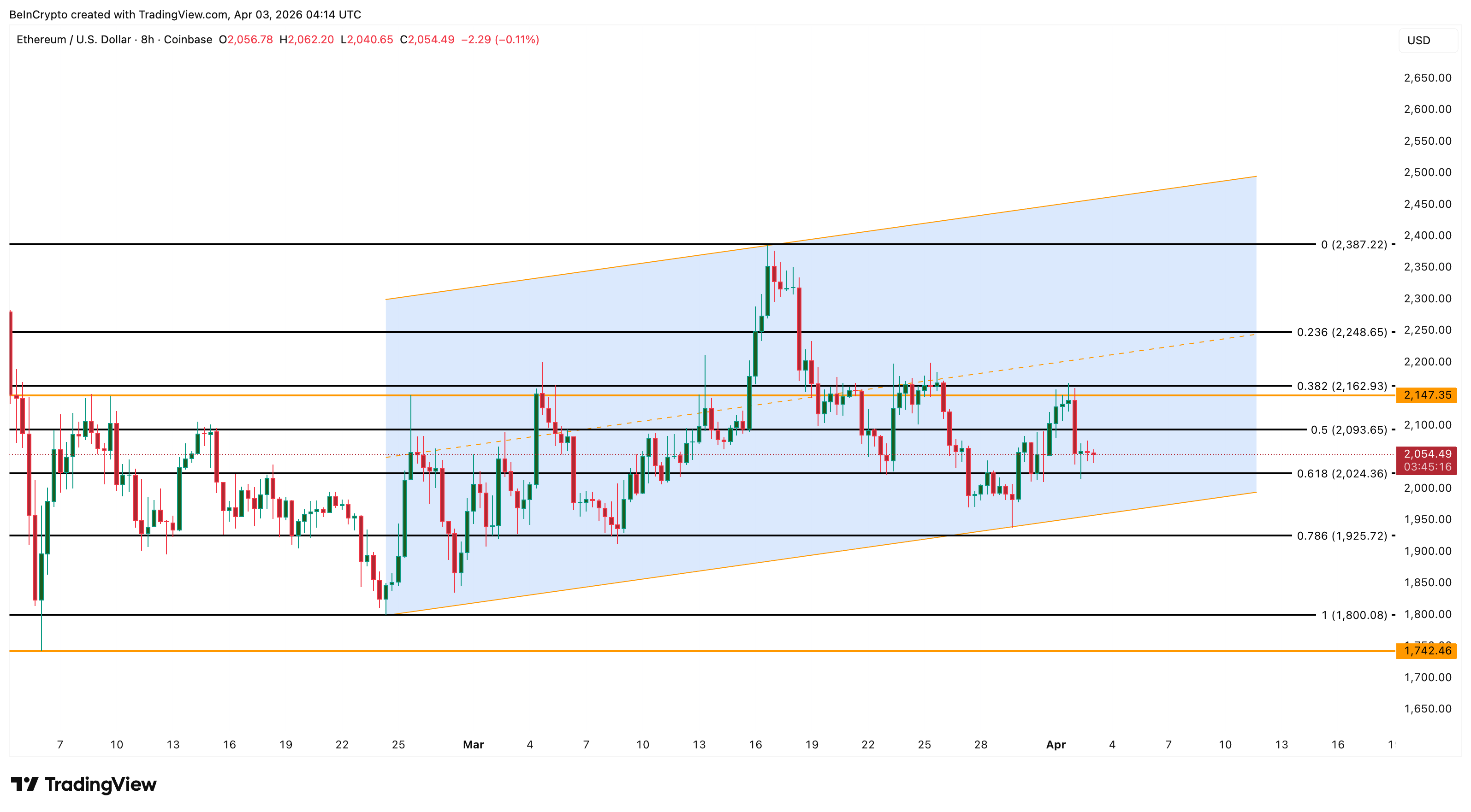 Ethereum (ETH) kursen ligger tæt på $2.055 den 3. april og befinder sig i en stigende kanal på 8-timers chartet, som har styret kursudviklingen siden 24. februar.