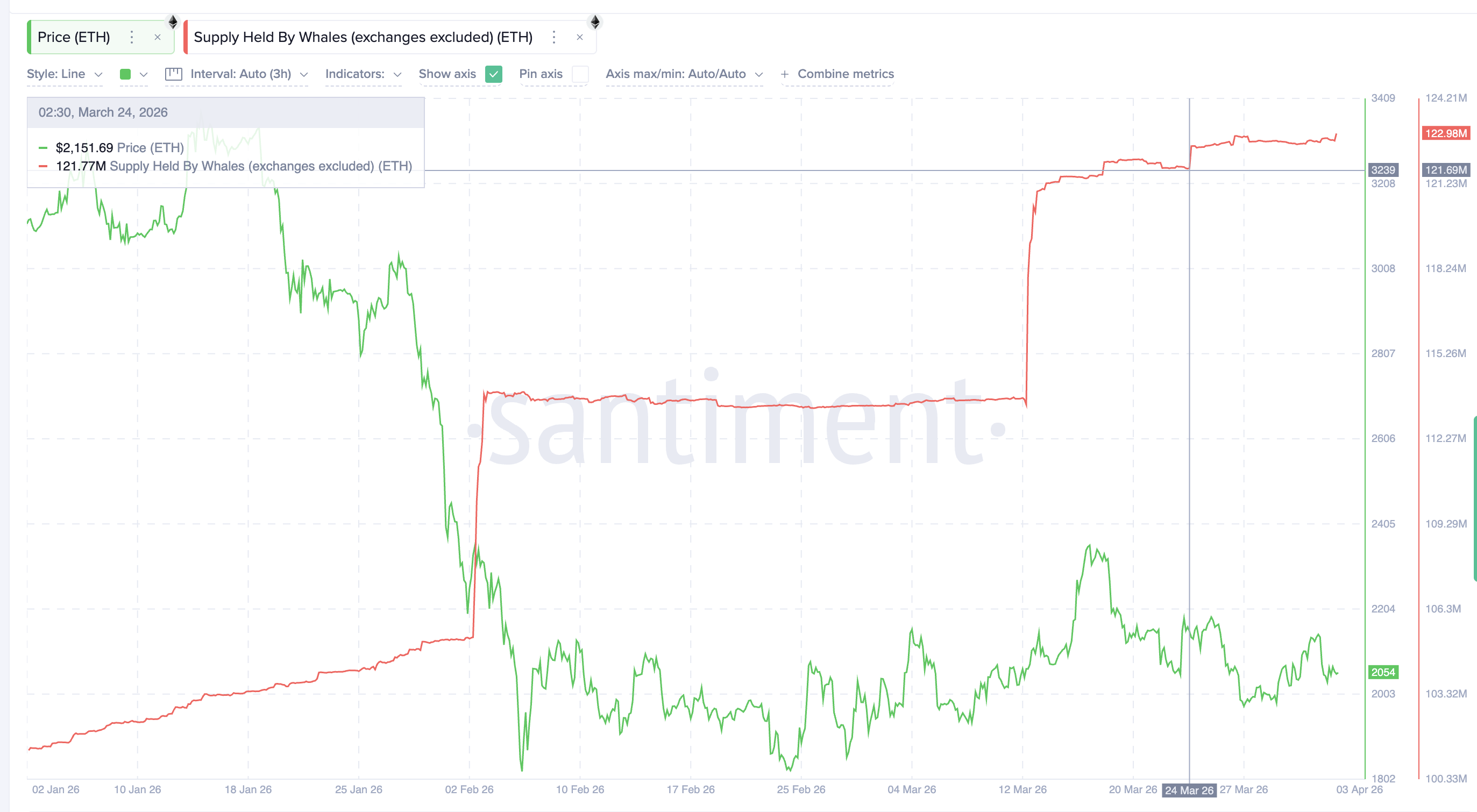 On-chain data fra Santiment viser, at Ethereum-hvaler – wallets uden børseadresser – har købt støt op siden 24. marts. På den dato var hvalernes beholdning 121,69 millioner ETH. Den 3. april var tallet steget til 122,98 millioner ETH, hvilket svarer til ca. 1,29 millioner ekstra tokens.