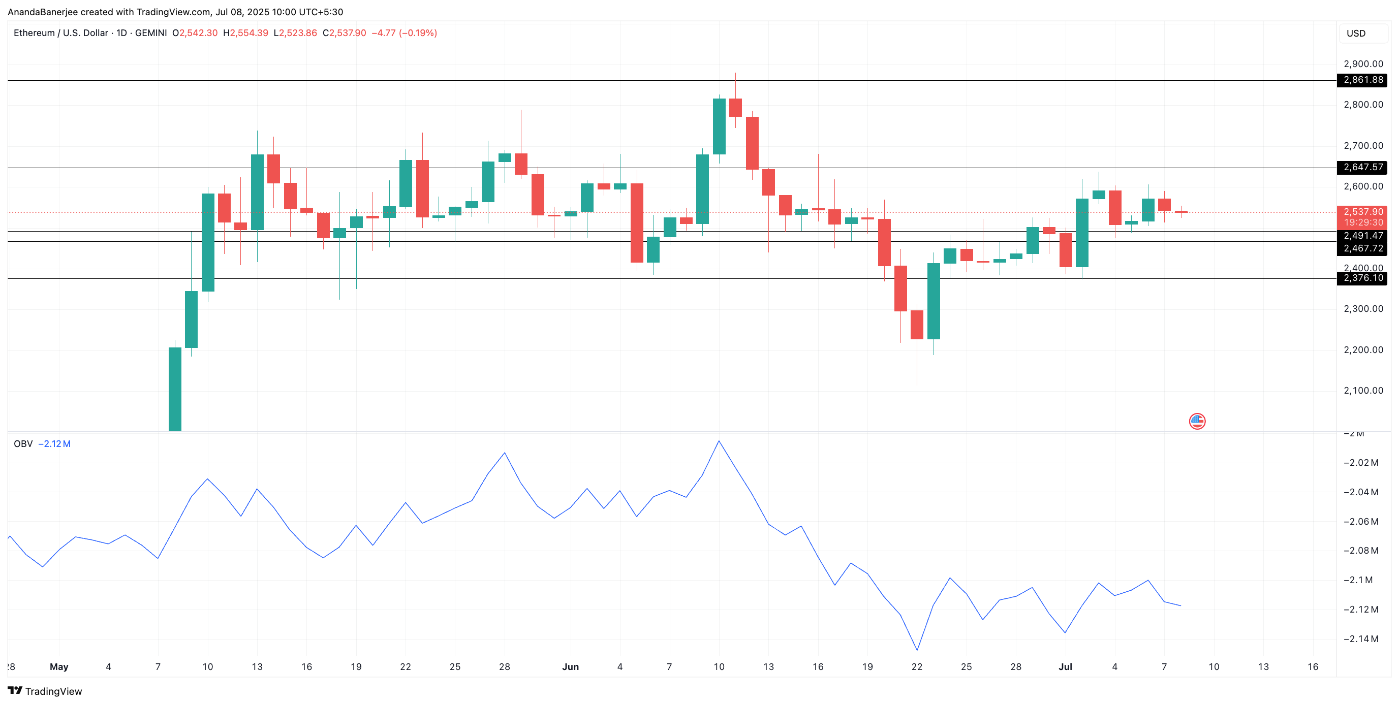 Ethereum er i øjeblikket fanget under nøglemodstand ved $2.647. Hvis momentum svækkes yderligere, ligger støtten ved $2.491 og $2.467. Et fald under $2.467 kan trække kursen mod $2.376.