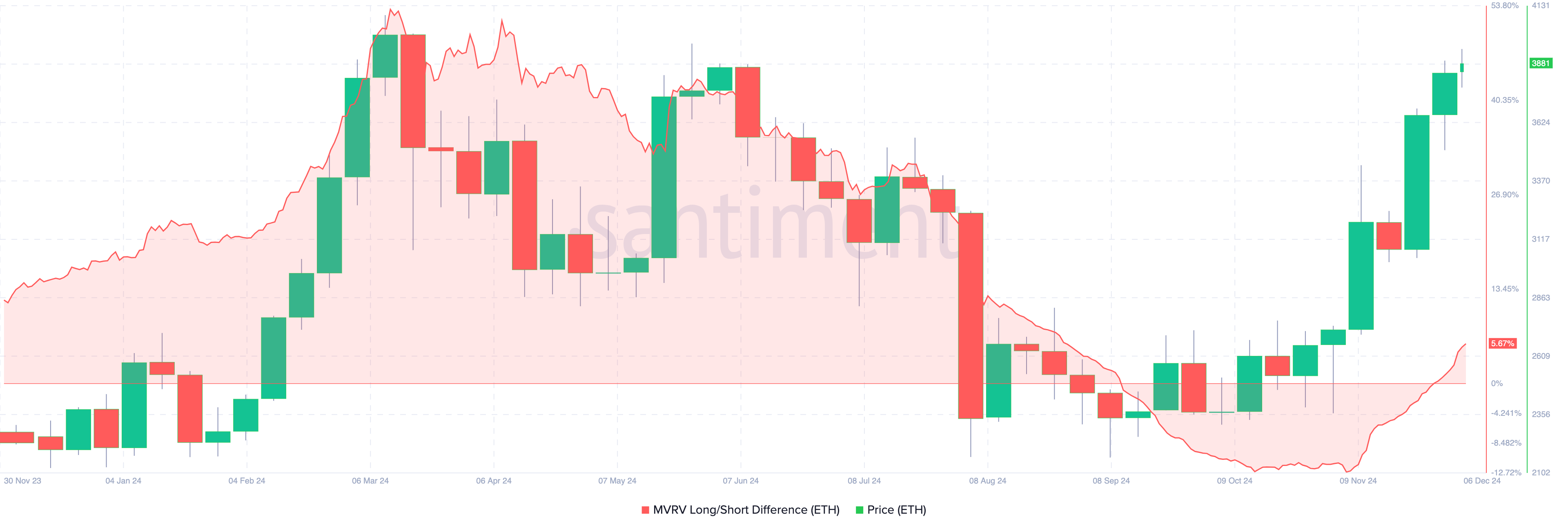 Når målingen er negativ, betyder det, at kortsigtede indehavere har overtaget. I de fleste tilfælde er dette bearish for kursen. Men ifølge Santiment er Ethereums MVRV Long/Short Difference steget til den positive zone på 5,67%, hvilket indikerer, at trenden er bullish og kryptovalutaen er undervurderet.