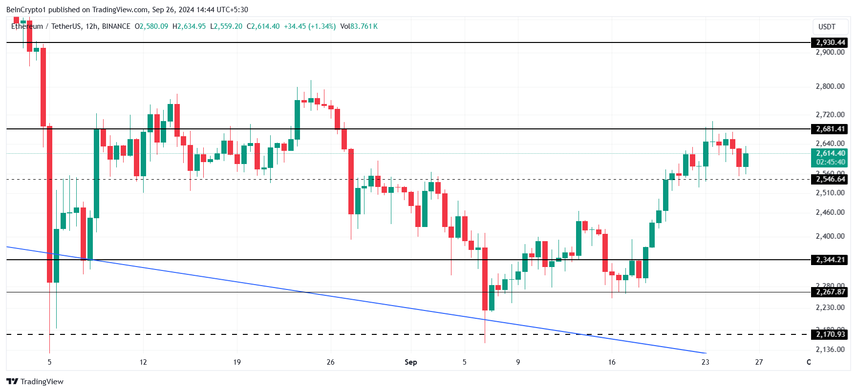 Ethereums kurs handles i øjeblikket til $2,614, og holder sig over støtten på $2,546. Men modstanden på $2,681 har været en forhindring de sidste fem uger. Ethereum kursbevægelser er begrænset af disse niveauer, hvilket efterlader kryptovalutaen i en konsolideringstilstand.