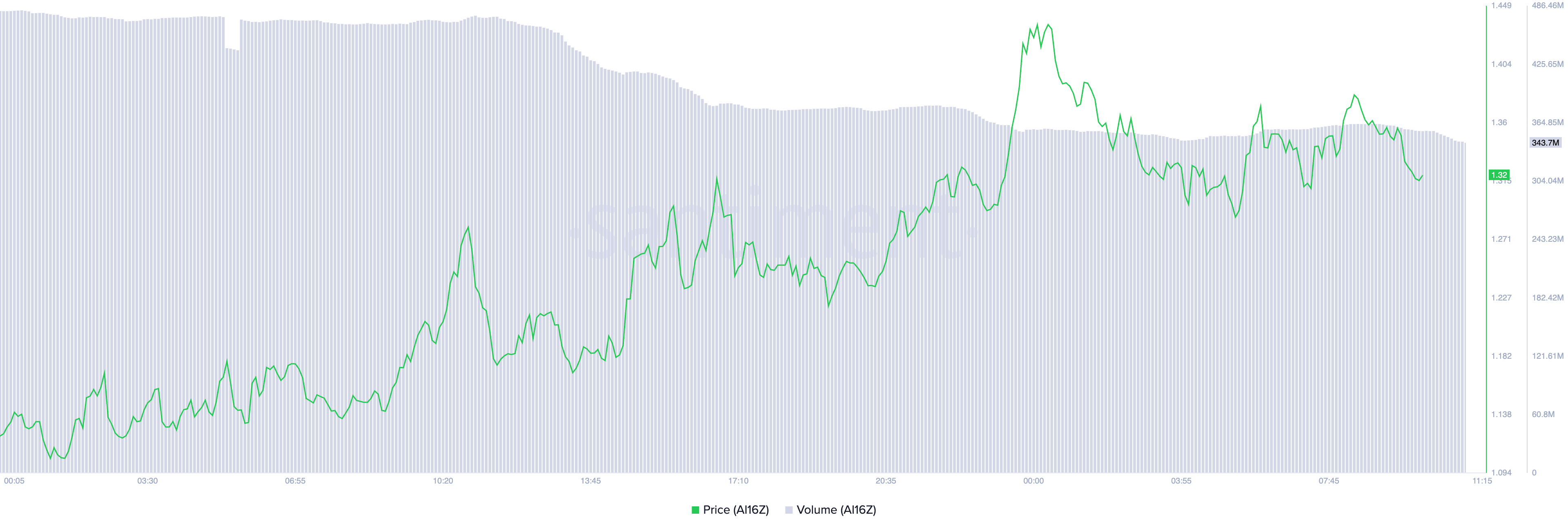 AI16Z handler i øjeblikket til $1,29, med en kursstigning på 9% over de sidste 24 timer. Men dens handelsvolumen er faldet med 27% i den periode, hvilket afspejler en mangel på reel efterspørgsel efter den AI-baserede token.