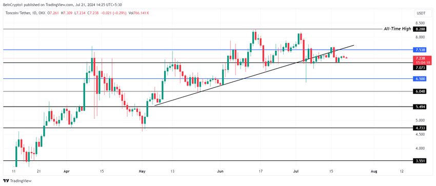 Siden begyndelsen af juli har Toncoins kurs på $7.23 testet $7.53 og $7.07 som modstand og støtte. Dette har resulteret i dannelsen af en konsolideringszone, som TON ikke har været i stand til at bryde ud af.