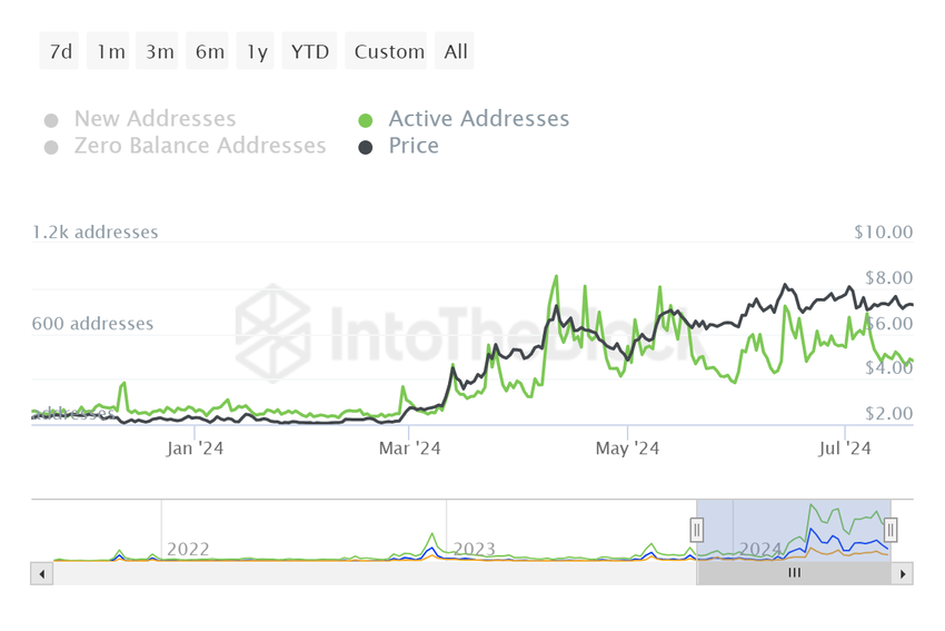 Toncoins aktive adresser har også oplevet et markant fald, med et registreret fald på 42%. Denne reduktion i aktive adresser understreger et fald i markedsdeltagelsen, hvilket yderligere kunne påvirke TONs prisudvikling.
