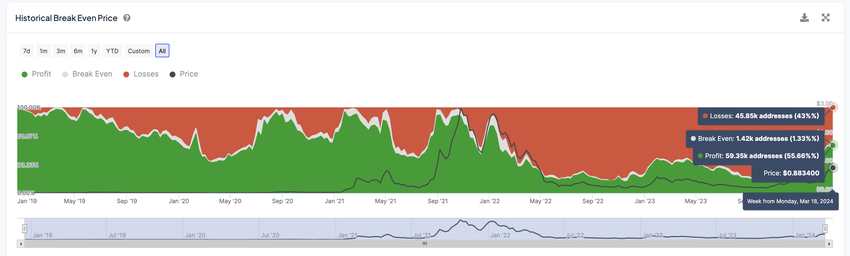 Den historiske break-even-pris henviser til den gennemsnitlige pris, som nuværende indehavere har købt deres tokens til. I bund og grund er det det prispunkt, hvor investorer hverken ville tjene penge eller lide tab, hvis de besluttede at sælge deres beholdning til den pris.