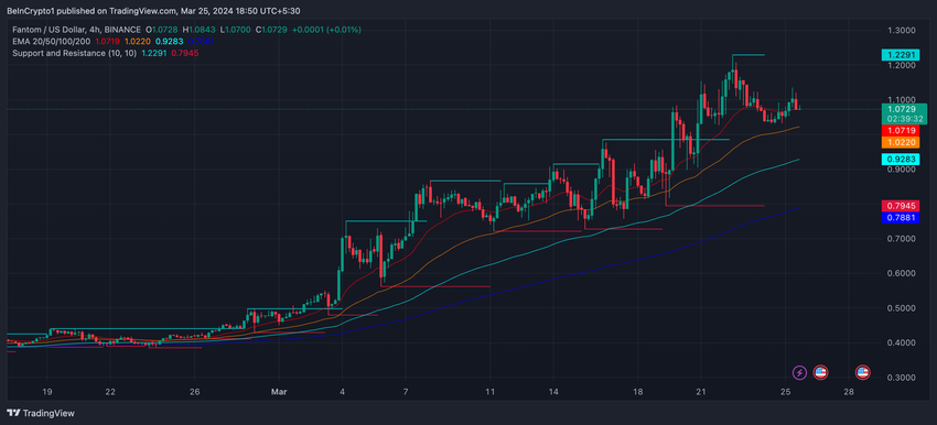 Når man undersøger 4-timers-diagrammet for FTM-pris, tegner de eksponentielle glidende gennemsnit (EMA’er) et bullish billede. Vi ser en tydelig lagdelingseffekt, hvor de kortsigtede EMA’er er placeret over de langsigtede.
