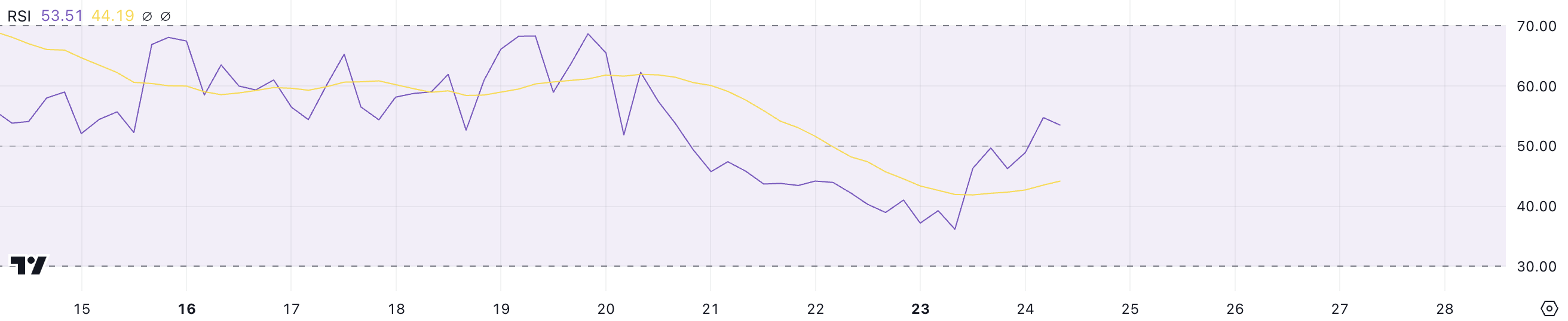 FARTCOIN’s Relative Strength Index (RSI) er i øjeblikket på 53,5, en markant stigning fra 36 blot en dag siden. Denne hurtige stigning indikerer en stærk stigning i købsmomentum, da tokenet bevæger sig fra en oversolgt eller svag markedsposition til en mere neutral zone.
