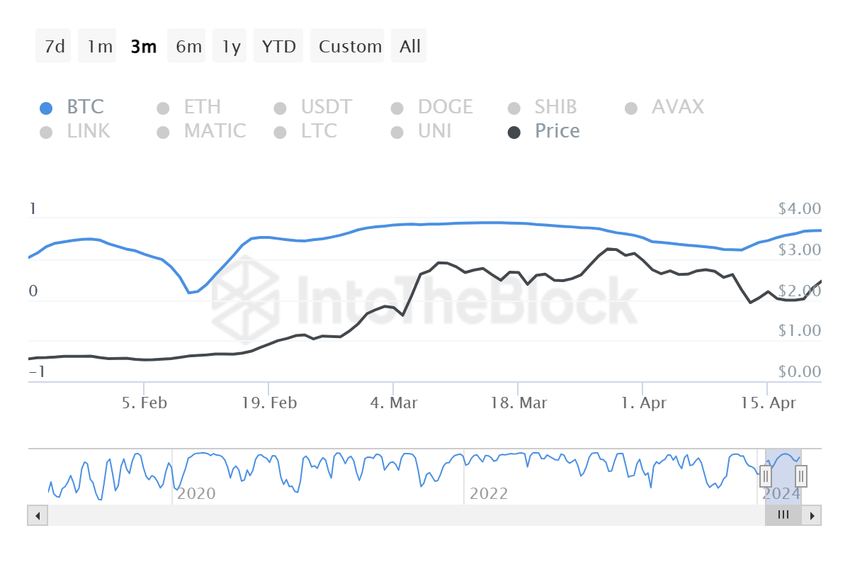 Dette rally kan komme før snarere end senere af flere grunde, hvoraf den ene er korrelationen mellem FET-aktier og Bitcoin. Verdens største kryptovaluta har netop gennemgået en halveringsbegivenhed, som finder sted hvert fjerde år og halverer minebelønningerne.