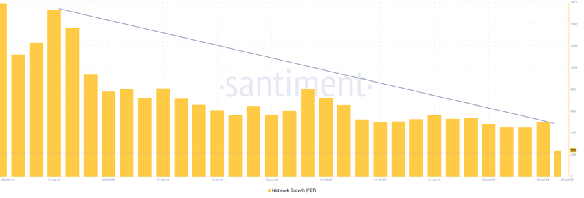 Desuden har projektets netværksvækst været faldende. Netværksvækst sporer antallet af nye adresser, der foretager deres første transaktion på en blockchain.