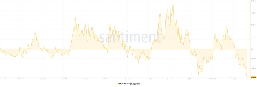 I øjeblikket er forholdet -33,78%. Historisk set når FET en mulighedszone, når MVRV-forholdet er mellem -10,18% og -29,99%.
