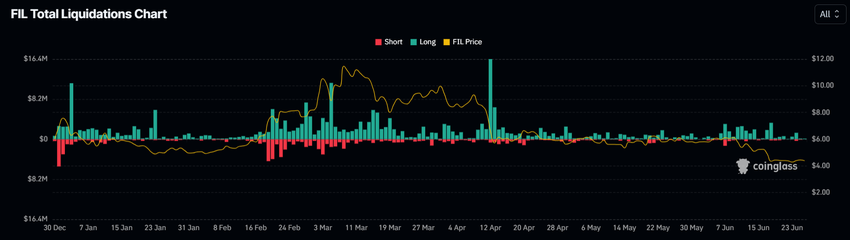 Den konsekvente nedtrapning i Filecoins pris har resulteret i lange likvidationer til en værdi af 20 millioner dollars siden begyndelsen af juni. Dette betydelige tab har skabt en bearish krusningseffekt i hele markedet.