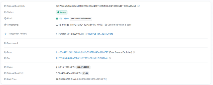 Jason Brink, President of Blockchain hos Gala Games, delte et link til on-chain-dataene for den stjålne fondsreturtransaktion. Ifølge dataene har adressen, der er mærket som Gala Games Exploiter, returneret 5.913 ETH til en værdi af ca. 22,37 millioner dollars med den nuværende pris.