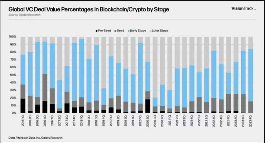 Desuden kaster Galaxy Digitals rapport også lys over betydningen af deres nye fond. Globalt set sikrede venturekapitalfirmaer, med fokus på krypto/blockchain, sig kun 5,75 milliarder dollars i 2023, et kraftigt fald fra rekorden i 2022 på 37,7 milliarder dollars.