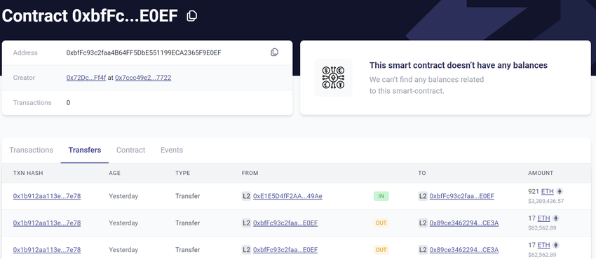Den 7. juni afsluttede det Matter Labs-støttede Ethereum layer-2-netværk zkSync sin v24-opgradering. Opdateringen løste problemet med den smarte kontrakt og gav adgang til Gemholics låste midler. Men ifølge data fra kæden trak Gemholic-teamet 921 ETH tilbage og overførte dem til Ethereum-blockchainen i stedet for at returnere midlerne til investorerne.