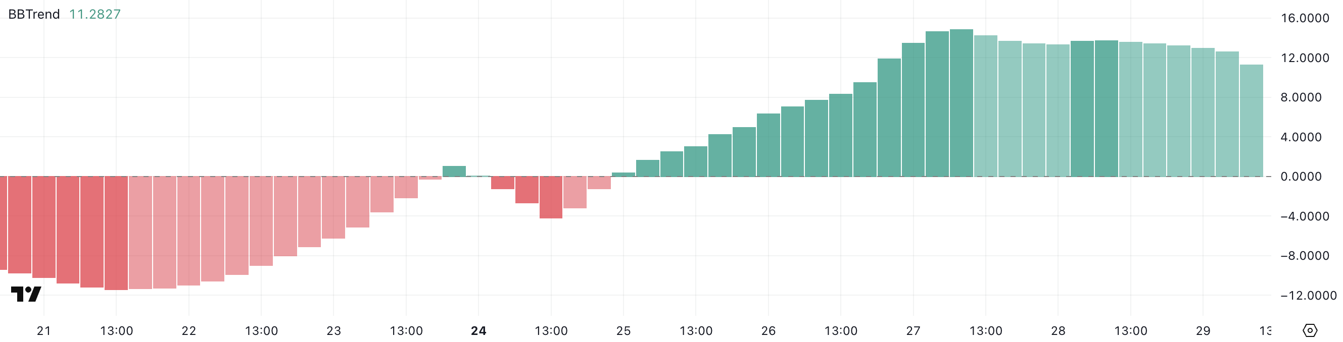Vedvarende positive BBTrend-aflæsninger signalerer typisk, at købere forbliver i kontrol, og at opadgående momentum kan fortsætte.