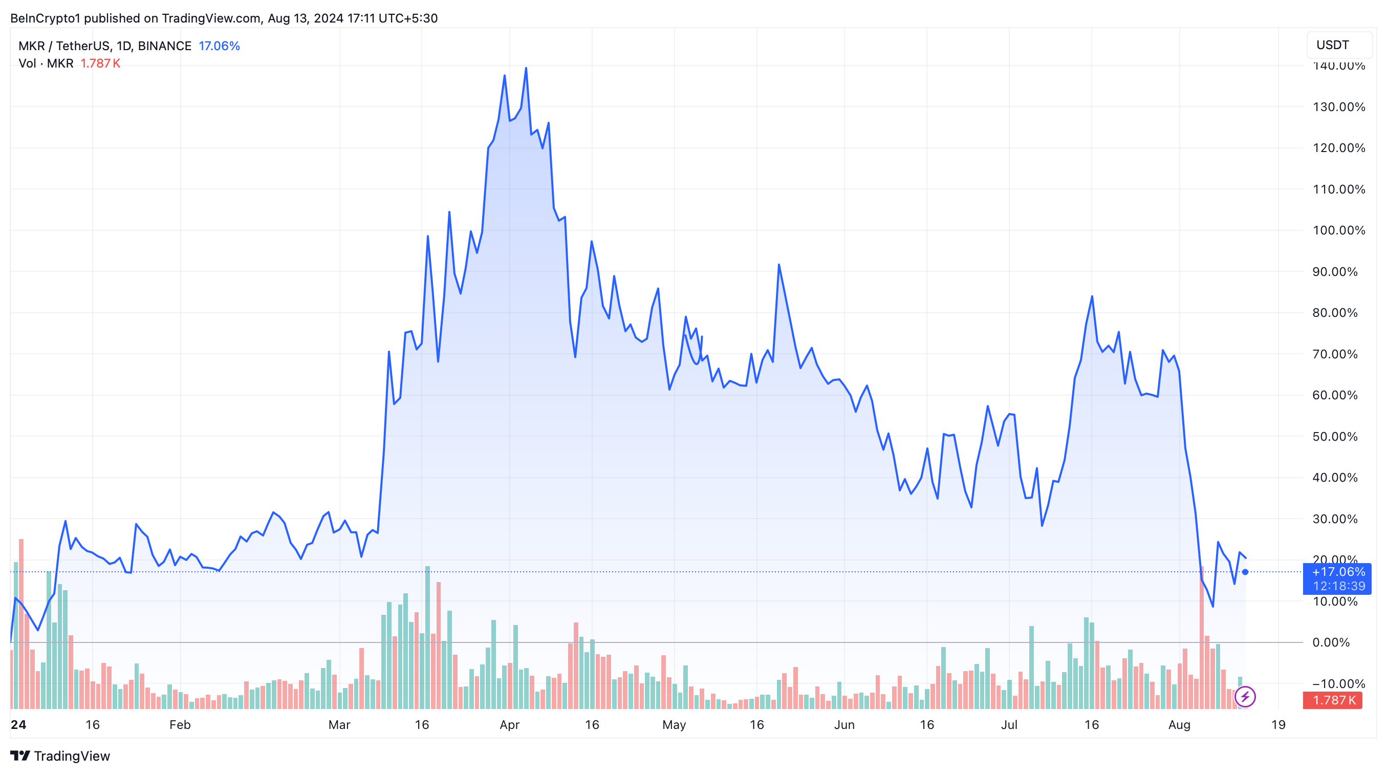 Trods en generel nedgang på kryptomarkedet i år, har MKR vist stærk præstation. Altcoinen er steget med 17% siden januar 2024, hvilket viser dens relative styrke sammenlignet med andre tokens.