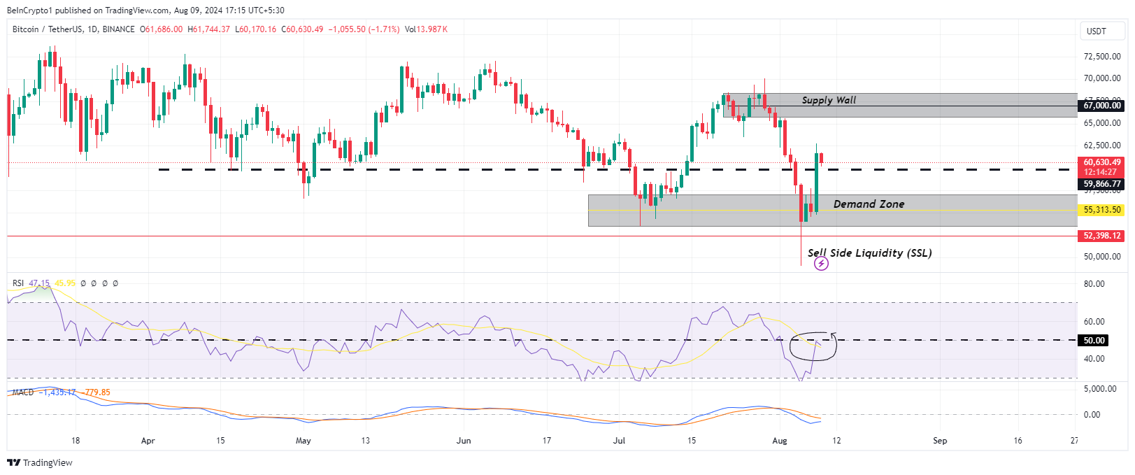 Bitcoin-dagens diagram indikerer, at BTC er positioneret til at fortsætte sin stigning, selvom lav overbevisning blandt bulls, som afspejles af Relative Strength Index (RSI) forbliver under 50, udgør en udfordring. Men stærk støtte omkring $59,866 kunne hjælpe Bitcoin med at udvide sine gevinster. En daglig lukning over midtpunktet af forsyningszonen ved $67,000 ville bane vejen for en ny test af ATH.