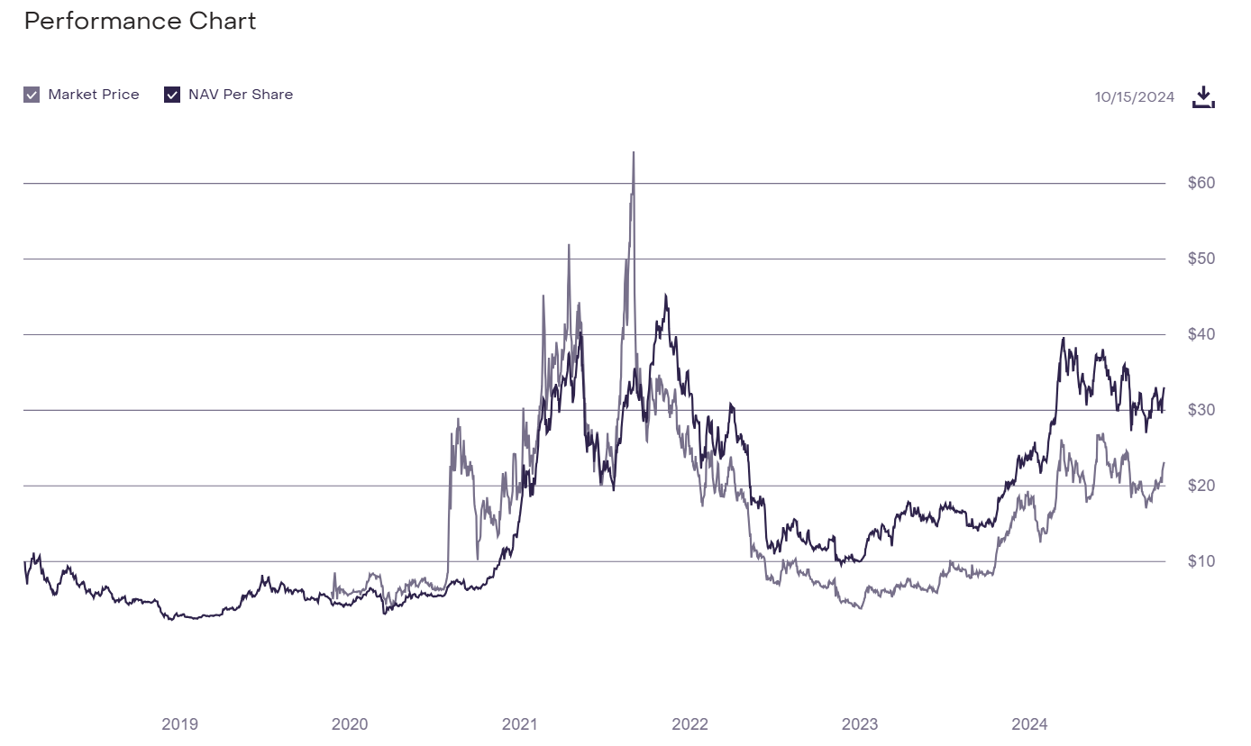 Kursdiagrammet, der sammenligner GDLC-aktier med deres nettoaktivværdi (NAV) pr. aktie, viser, at GDLC handles til en betydelig rabat på mere end 30%. Før Grayscale Bitcoin Trust (GBTC) blev en Bitcoin ETF, handlede den også til en rabat på over 40%, hvilket skabte udfordringer for Grayscale.