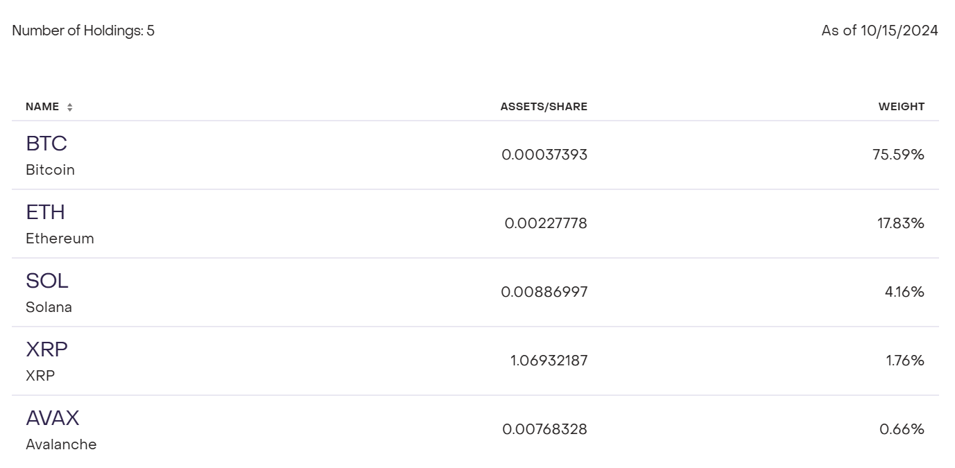 I øjeblikket forvalter GDLC mere end $524 millioner i aktiver. Ifølge den officielle hjemmeside udgør Bitcoin og Ethereum 94% af fonden, med 76% allokeret til BTC og 18% til ETH. De resterende aktiver – SOL, XRP og AVAX – repræsenterer mindre andele på henholdsvis 4,16%, 1,76% og 0,66%.